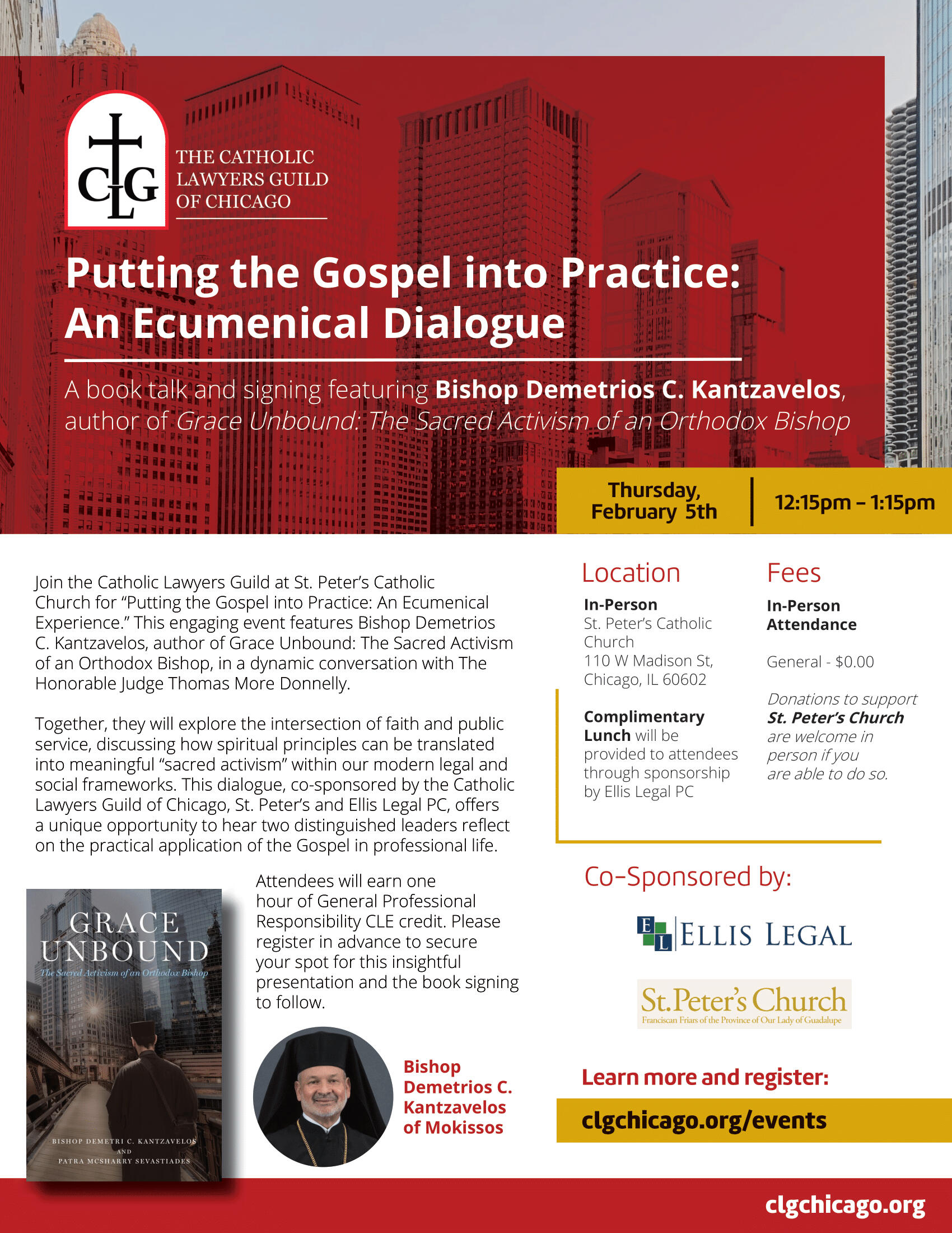 The Catholic Lawyers Guild of Chicago & St. Peter's Catholic Church presents:Putting the Gospel into Practice: An Ecumenical Experience◈ Talk, Lunch & Book Signing: 12:15 PM - 1:15 PM